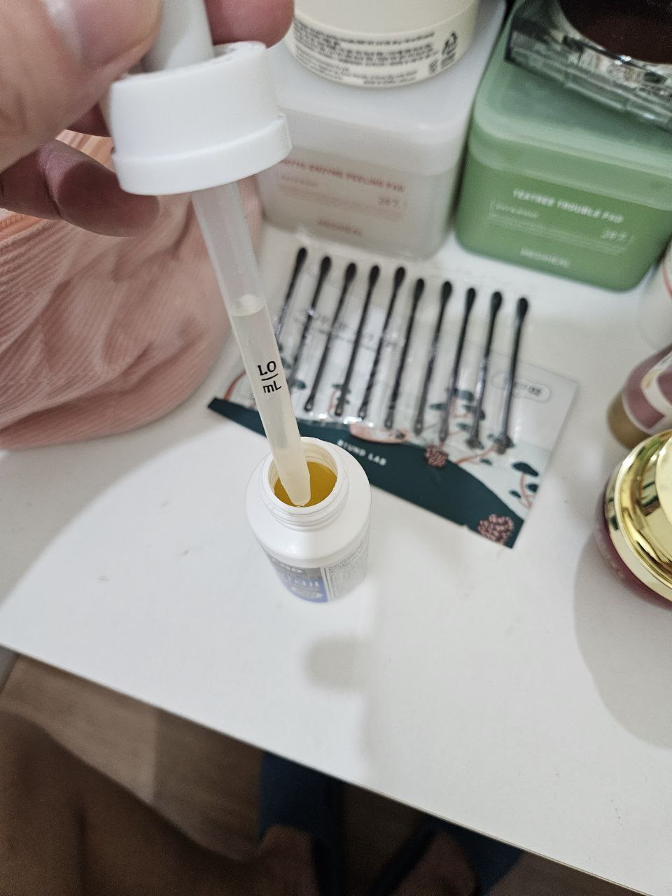 용기 뚜껑을 열어보니 액체는 완전히 투명하지 않고, 약간 노란빛을 띠고 있는 제형이었습니다. 처음에는 혹시 변질된 것은 아닐까 걱정이 되었지만, 미녹시딜 제품 특성상 이런 색감을 보이는 경우도 있다는 정보를 확인할 수 있었습니다.