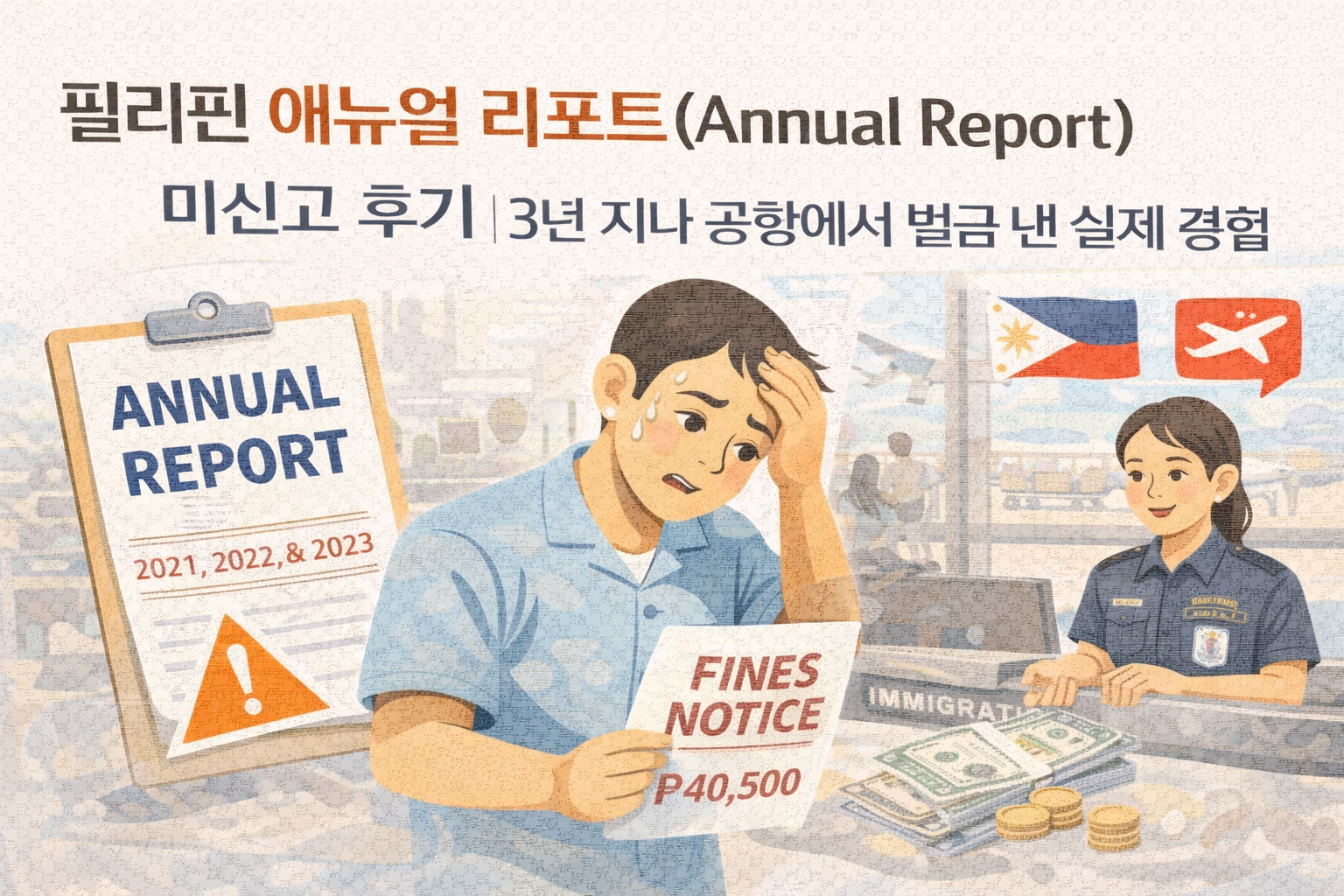 필리핀 결혼비자(13A), 워킹비자, 은퇴비자 소지자라면 매년 반드시 수행해야 하는 애뉴얼 리포트(Annual Report, AR). "안 해도 안 걸리던데?"라는 안일한 생각으로 3년을 미뤘다가 공항 출국 심사에서 12,000페소(약 35만 원)의 벌금을 낸 실제 경험담을 공유합니다.