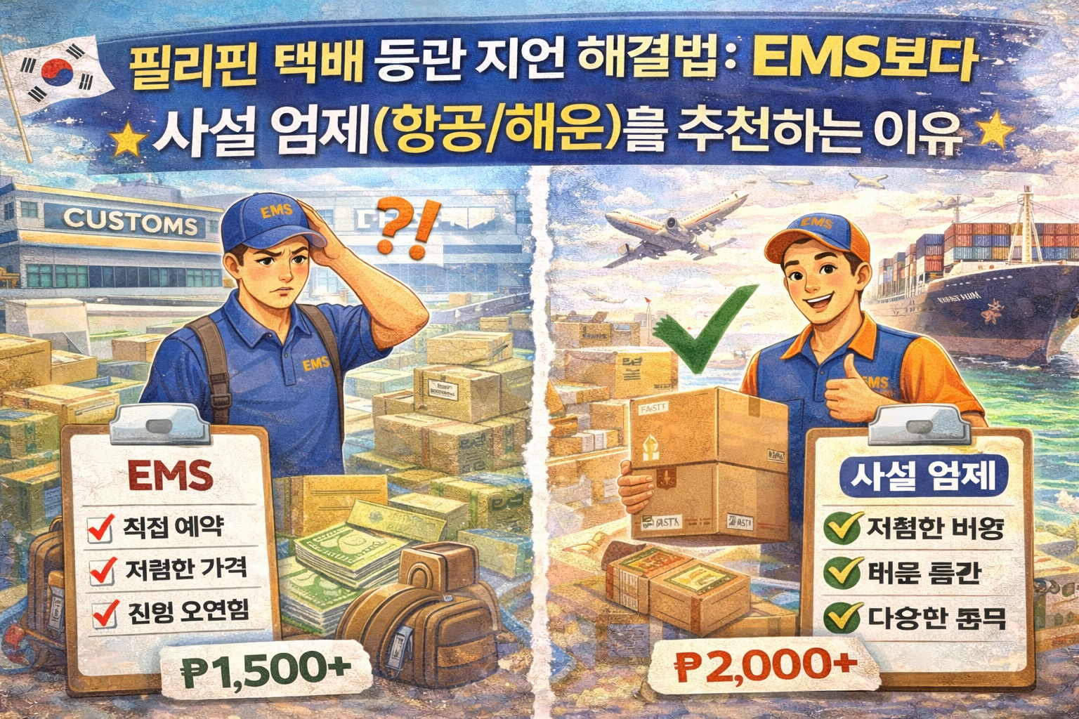 우체국 EMS는 필리핀에 도착하는 시간도 느리지만, 도착 후가 진짜 문제입니다. 필리핀 우체국 시스템상 통관 과정에서 예상치 못한 비용과 지연이 발생하기 때문입니다.