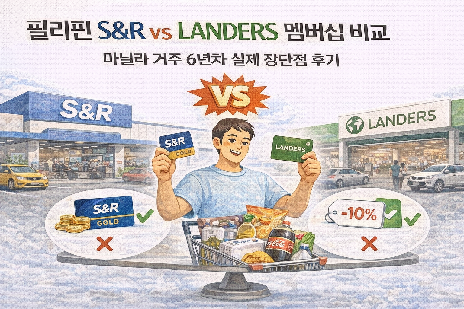 2019년부터 필리핀 마닐라에 거주하며 수많은 장을 봐온 교민 입장에서, 필리핀 생활의 필수품인 S&R과 LANDERS 멤버십을 전격 비교해 드립니다. 2026년 2월 직접 두 곳의 멤버십을 갱신 및 신규 가입하며 느낀 생생한 장단점을 확인해 보세요.